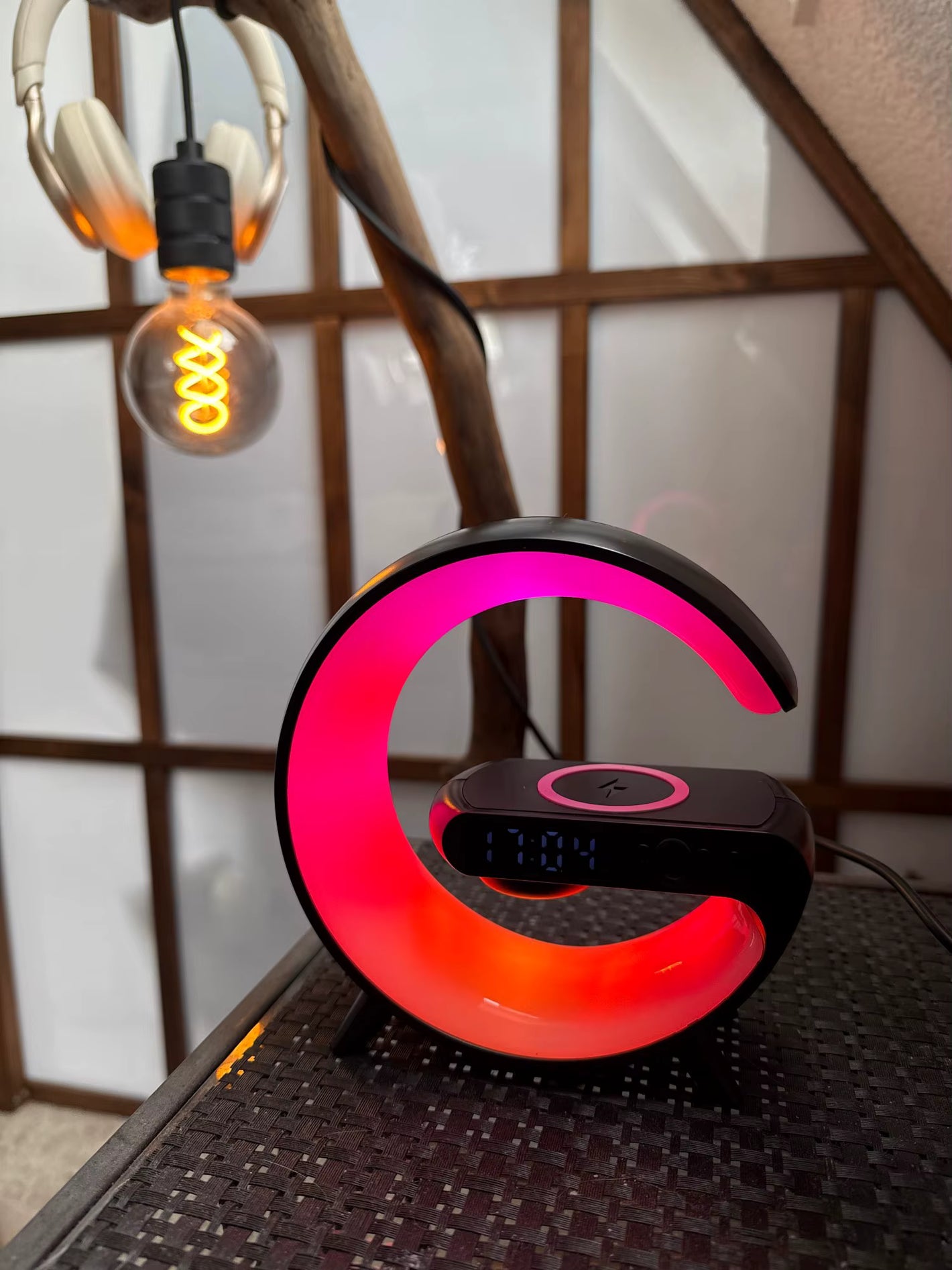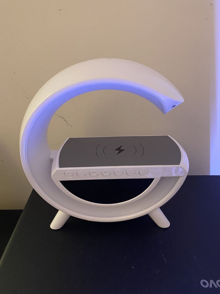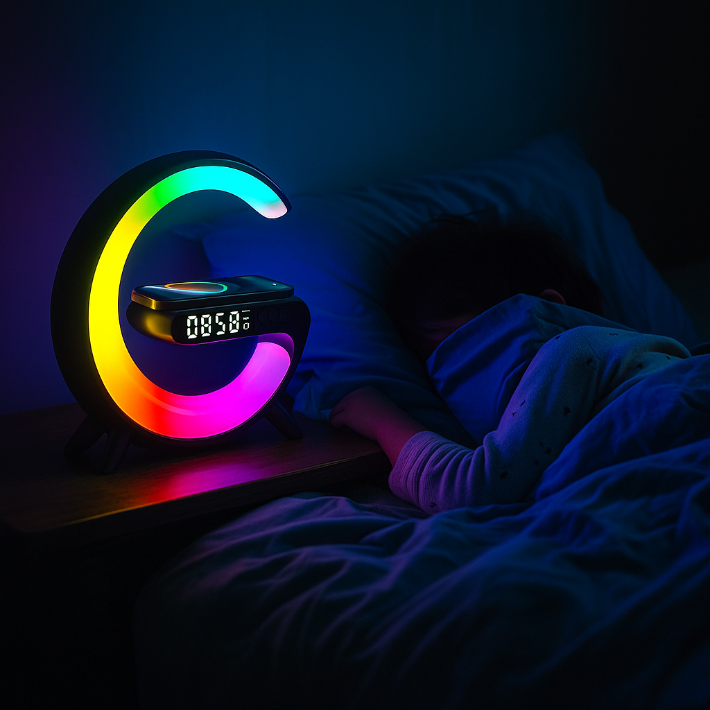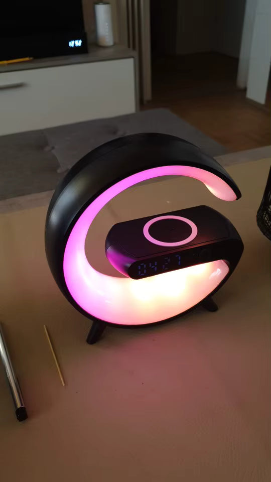 Convierte tu habitación en un espacio moderno, funcional y lleno de estilo. Este innovador dispositivo 6 en 1 combina altavoz Bluetooth, lámpara ambiental LED, reloj despertador, cargador inalámbrico y más — todo en un diseño elegante y compacto.